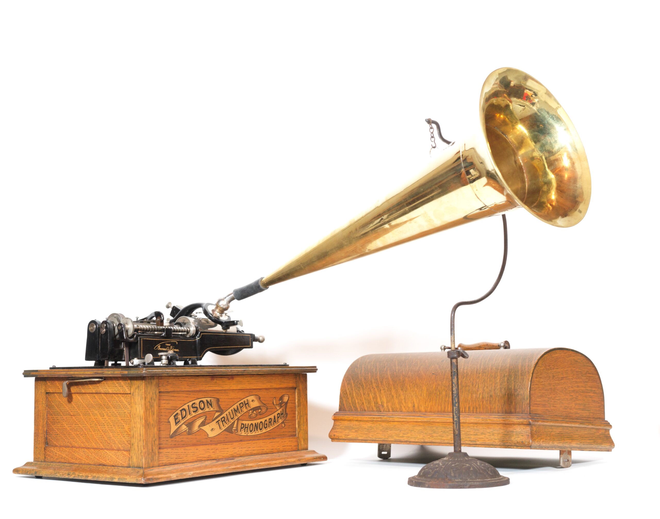 1901 Edison Triumph Phonograph With Rare, Working Type D Repeater, Original Table Crane & 24″ All Brass Horn