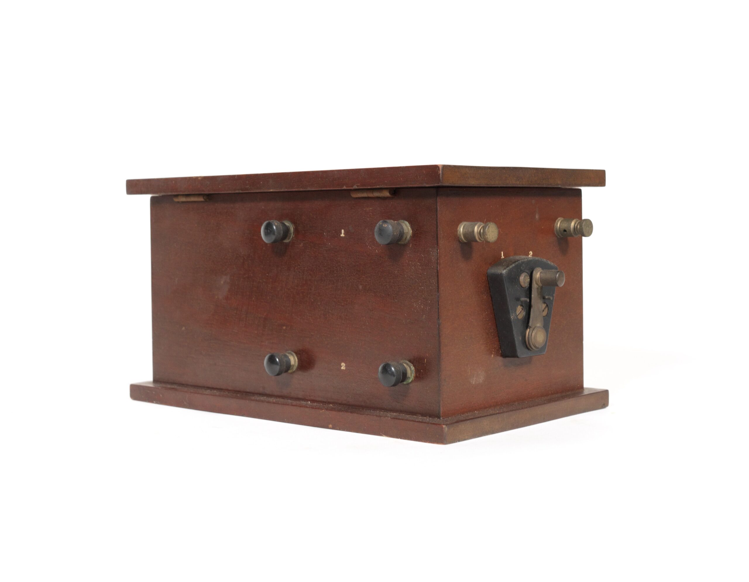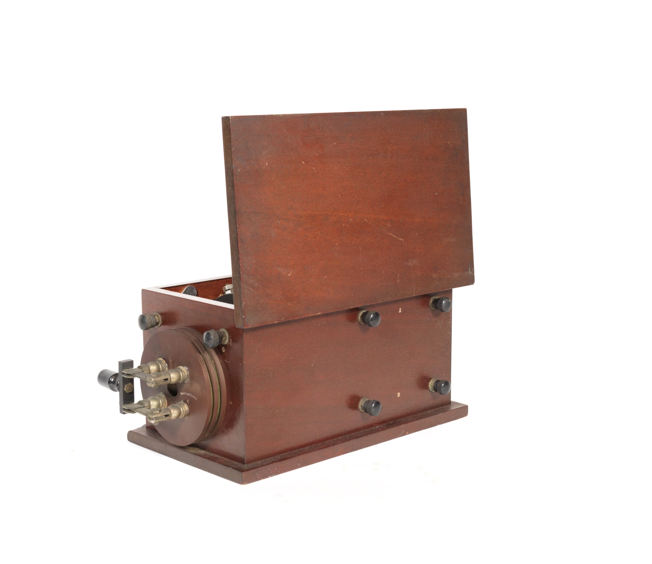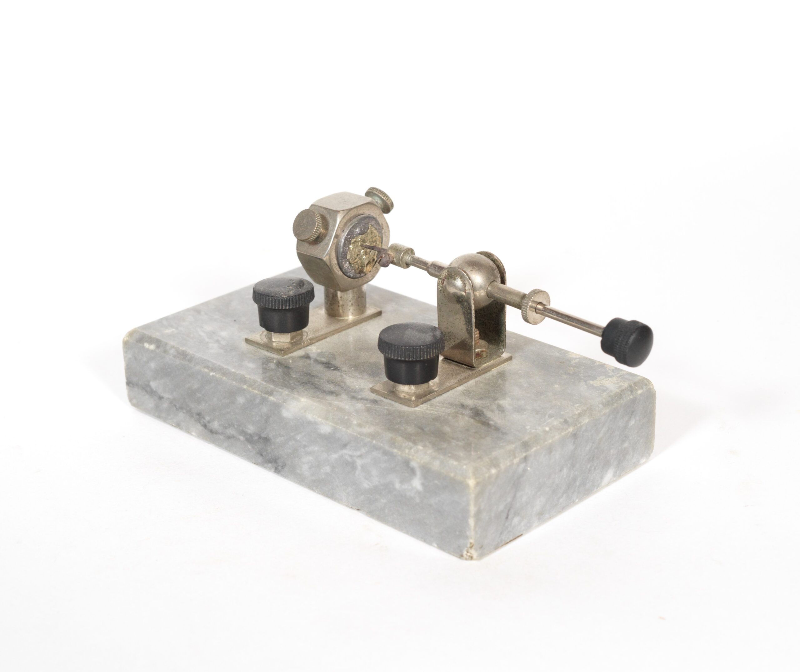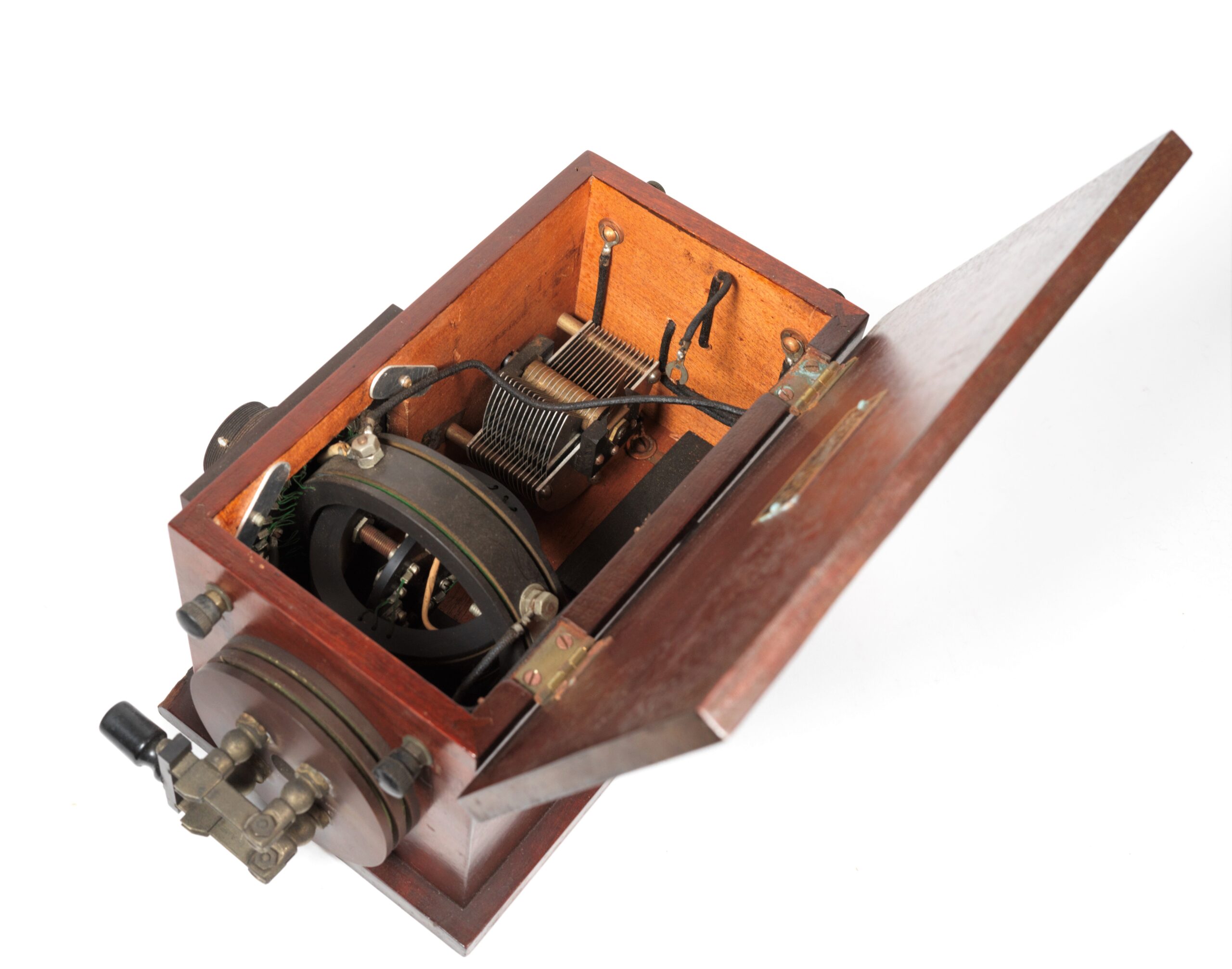 Condition of this outfit is excellent overall, and the receiver’s interior is pristine. The Universal Ferron Detector is complete and correct, and the Murdock 55 headset has good drivers. The Clapp Eastham tag on the underside of the lid is crisp and legible, and the detector stand is signed on back of the mineral holder.