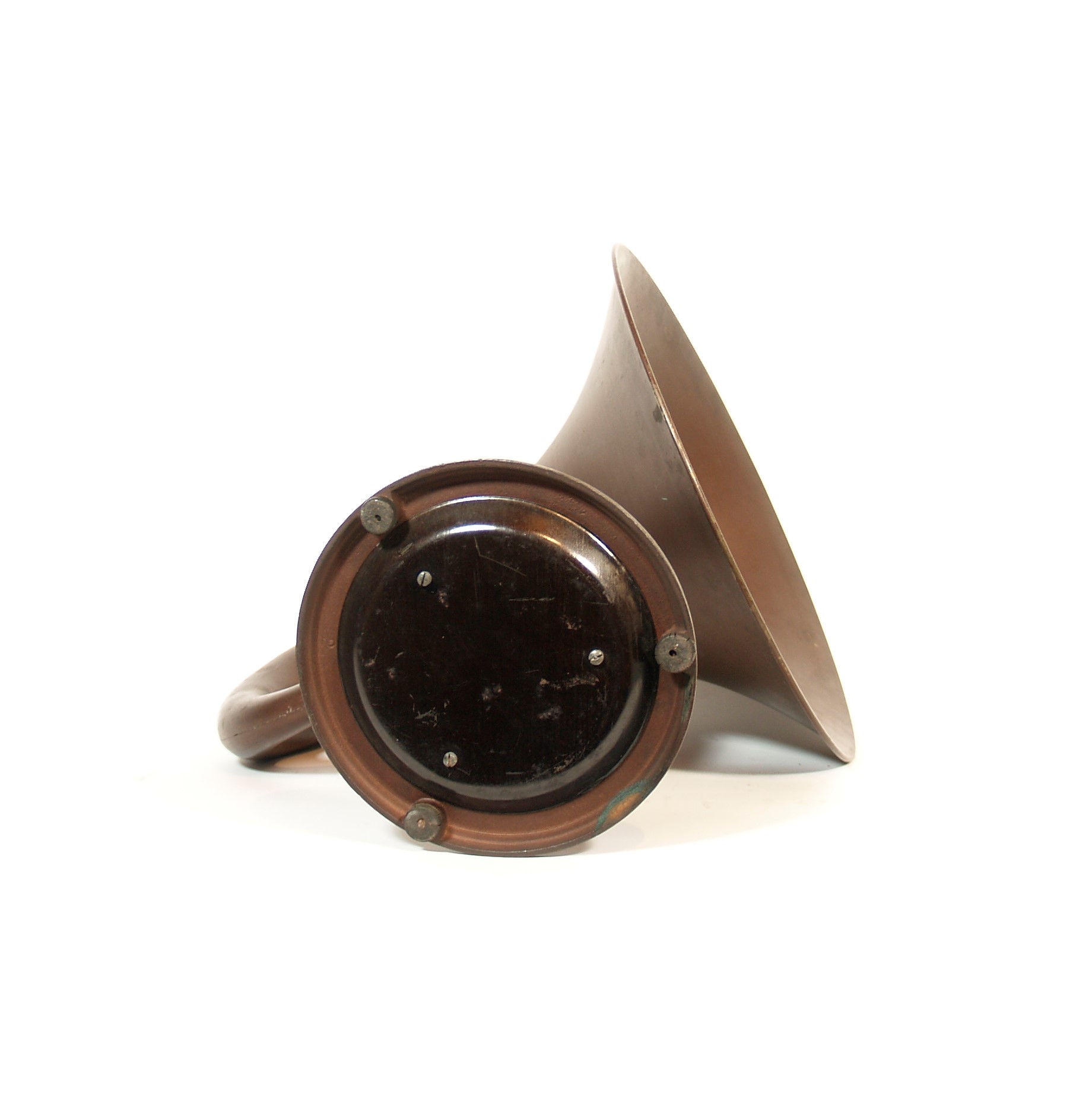 The speaker retains its original gold/copper paint, with no repainting, no touch-ups, no other restoration. The speaker driver is original, as are the connecting wires between the base and the driver housing. The driver is good, and the speaker still works.