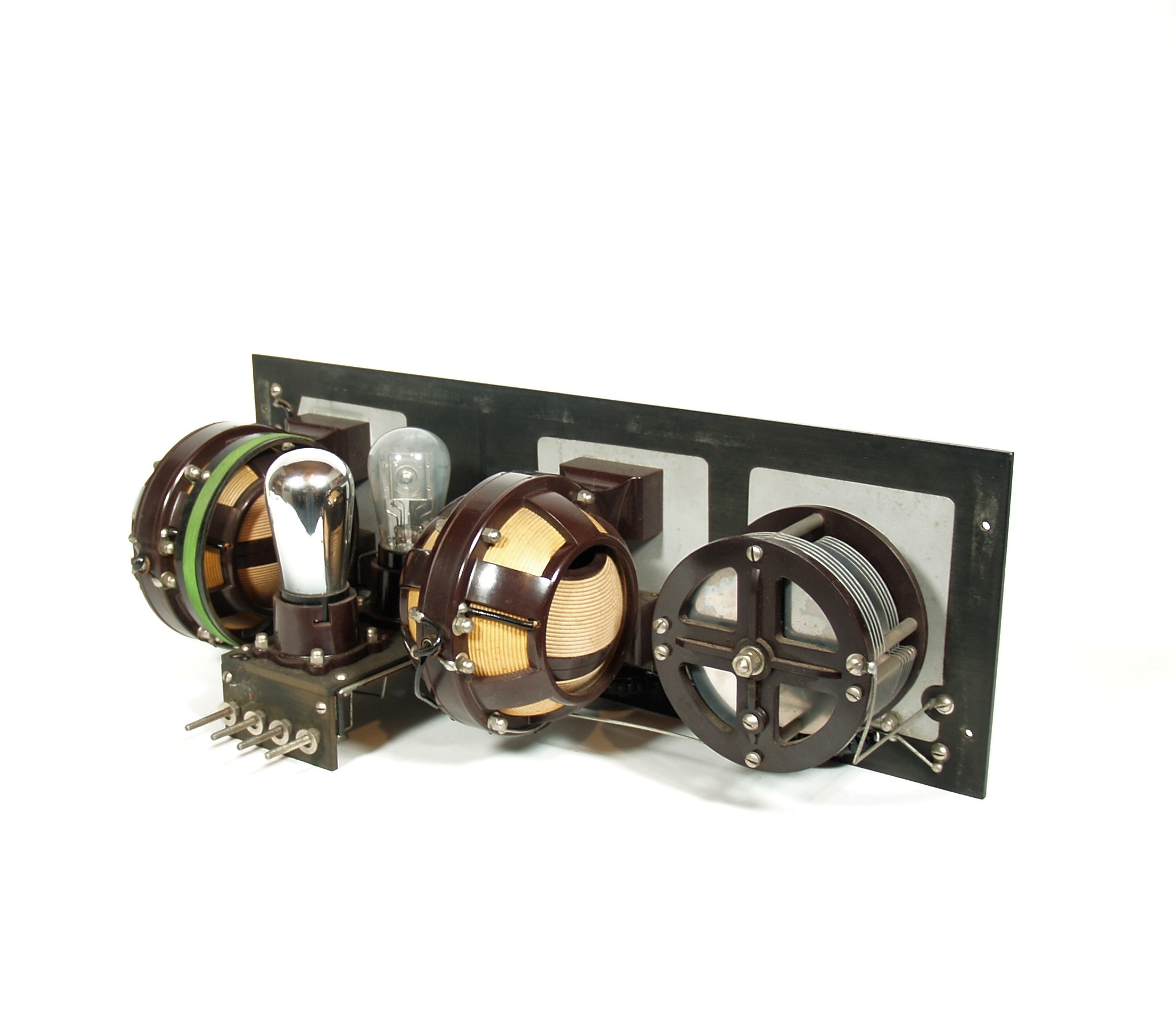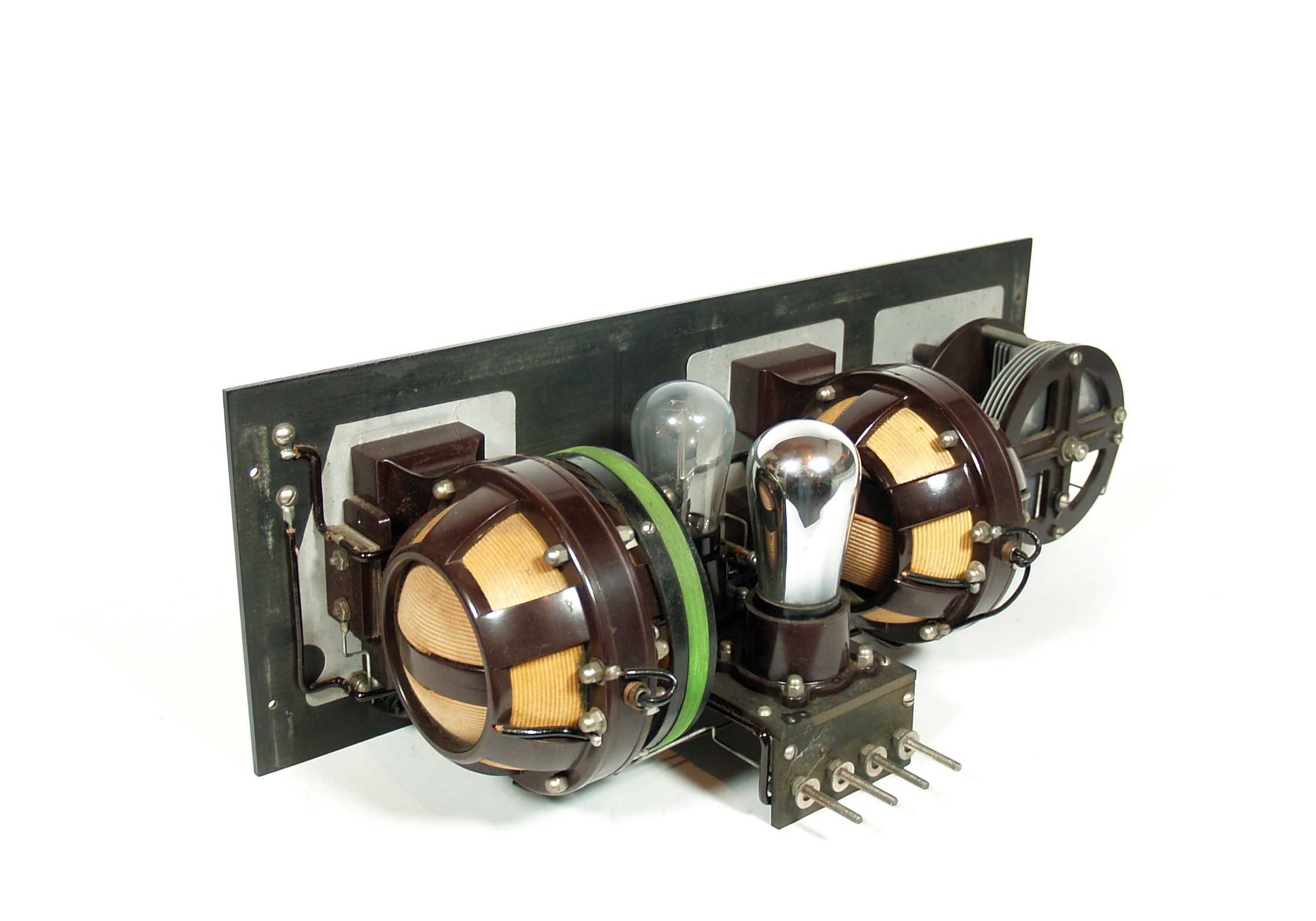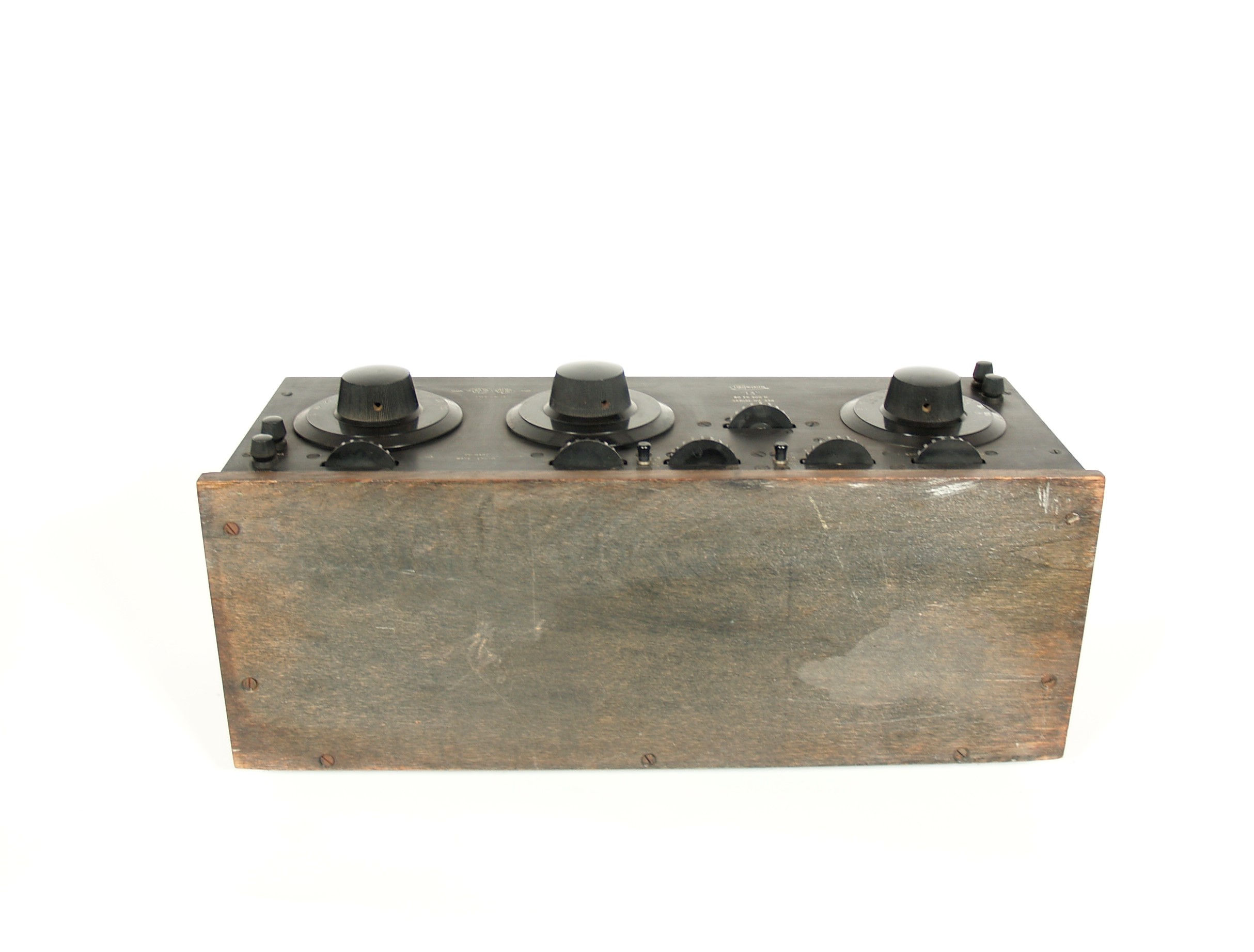 Condition of the receiver is excellent throughout. The brushed bakelite panel is clean and undamaged, with no chips, no cracks, no extra holes, no filled holes, no blotchy areas. Panel engraving is crisp and legible everywhere. Tuning dials are original and in excellent condition, with no issues. All binding post assemblies are original and complete and in excellent condition.