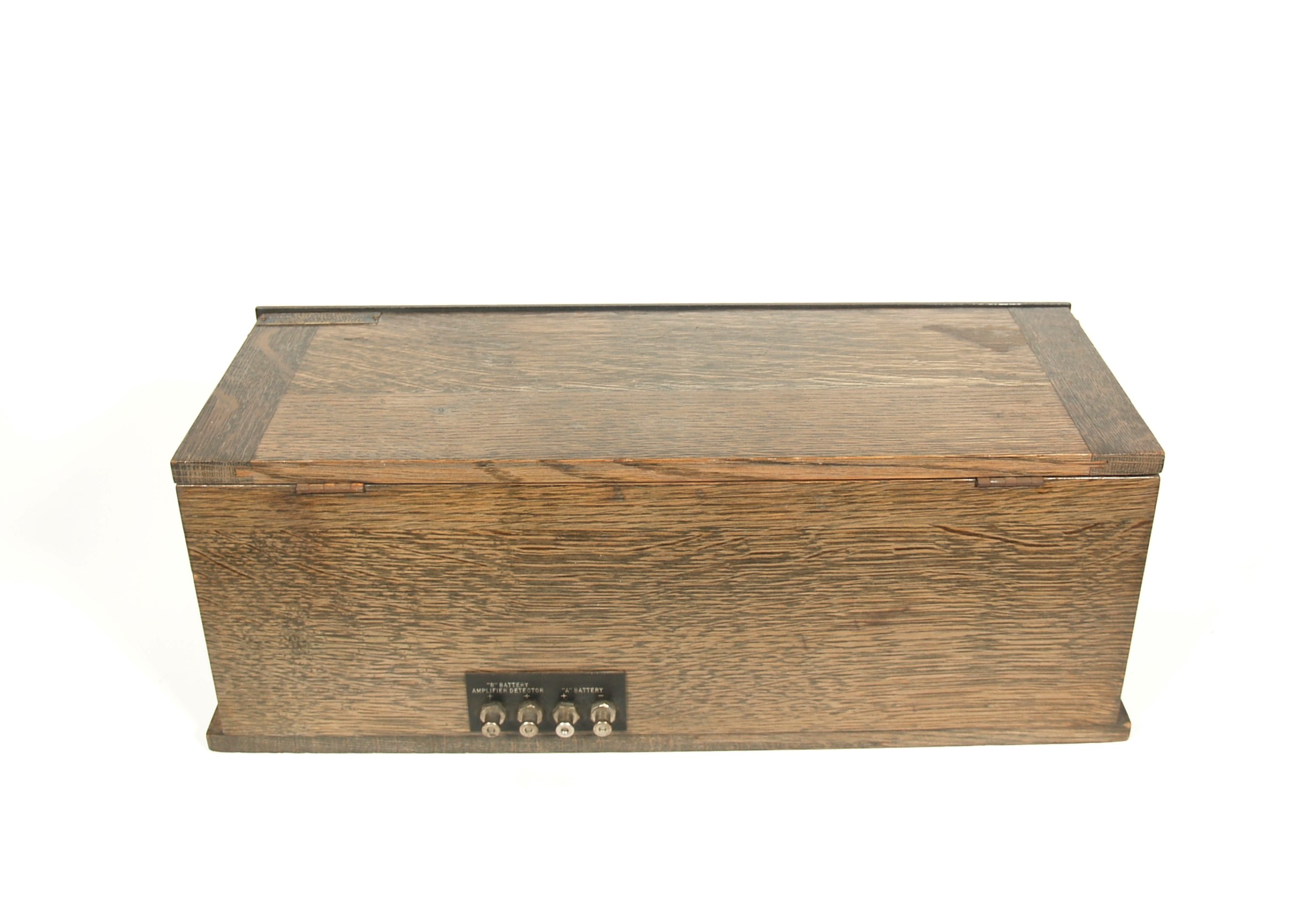 Chassis is in excellent condition, with original wiring throughout. Tuners are all tightly wound, with clean wire and nice original shellac. Variable condenser works properly, and it’s clean, with no corrosion or even any significant tarnish. Tube sockets are pristine. Fumed oak cabinet is in nice shape, with its original finish still intact and some finish wear evident but nothing significant. All cabinet joints are snug and secure.