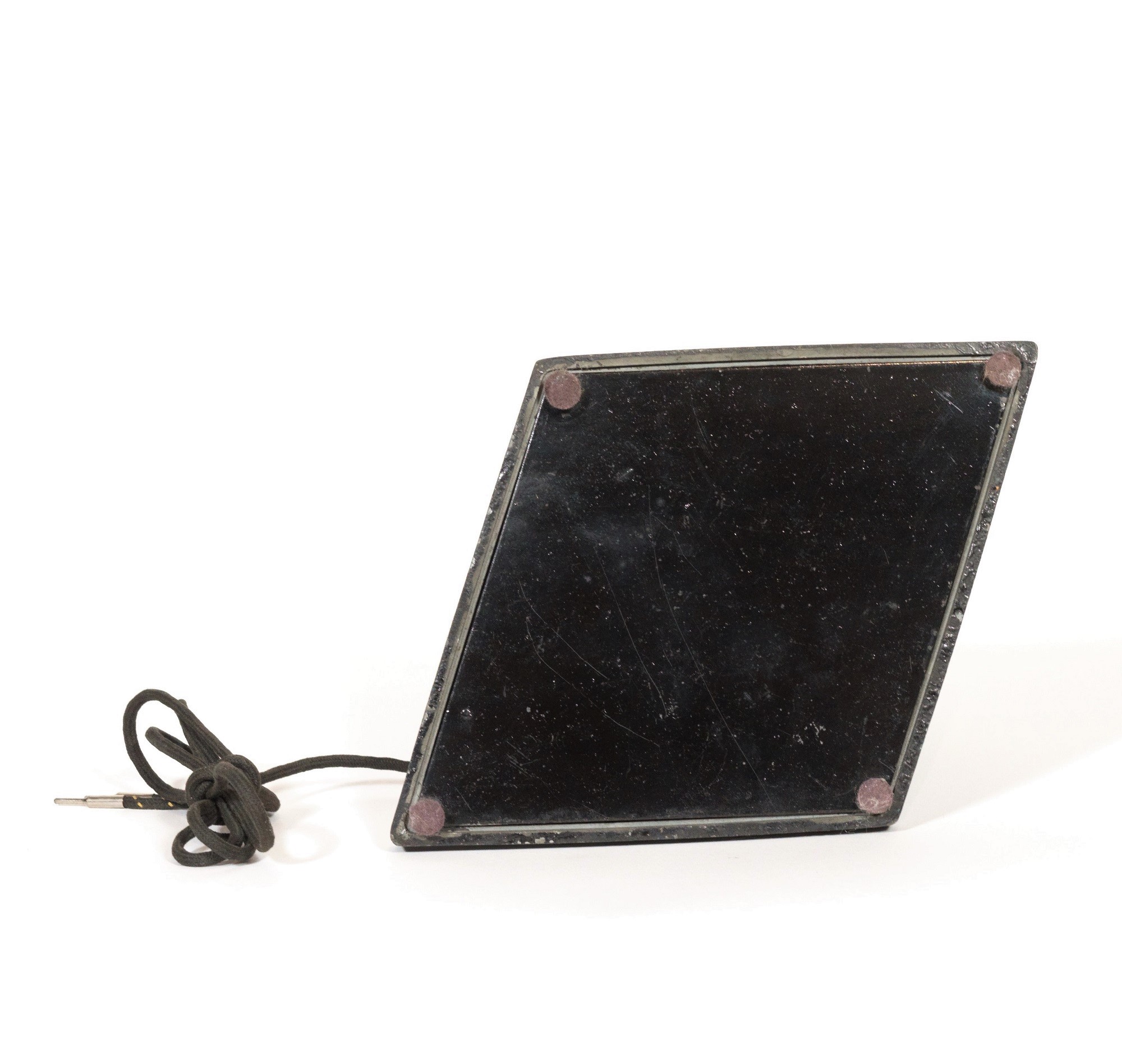 The speaker stands 30″ high, and its exponential horn consists of 4 triangular panels that spring from the base like a Euclidean flower to form a diamond-shaped bell at the top. The base is configured similarly, but in the opposite direction.