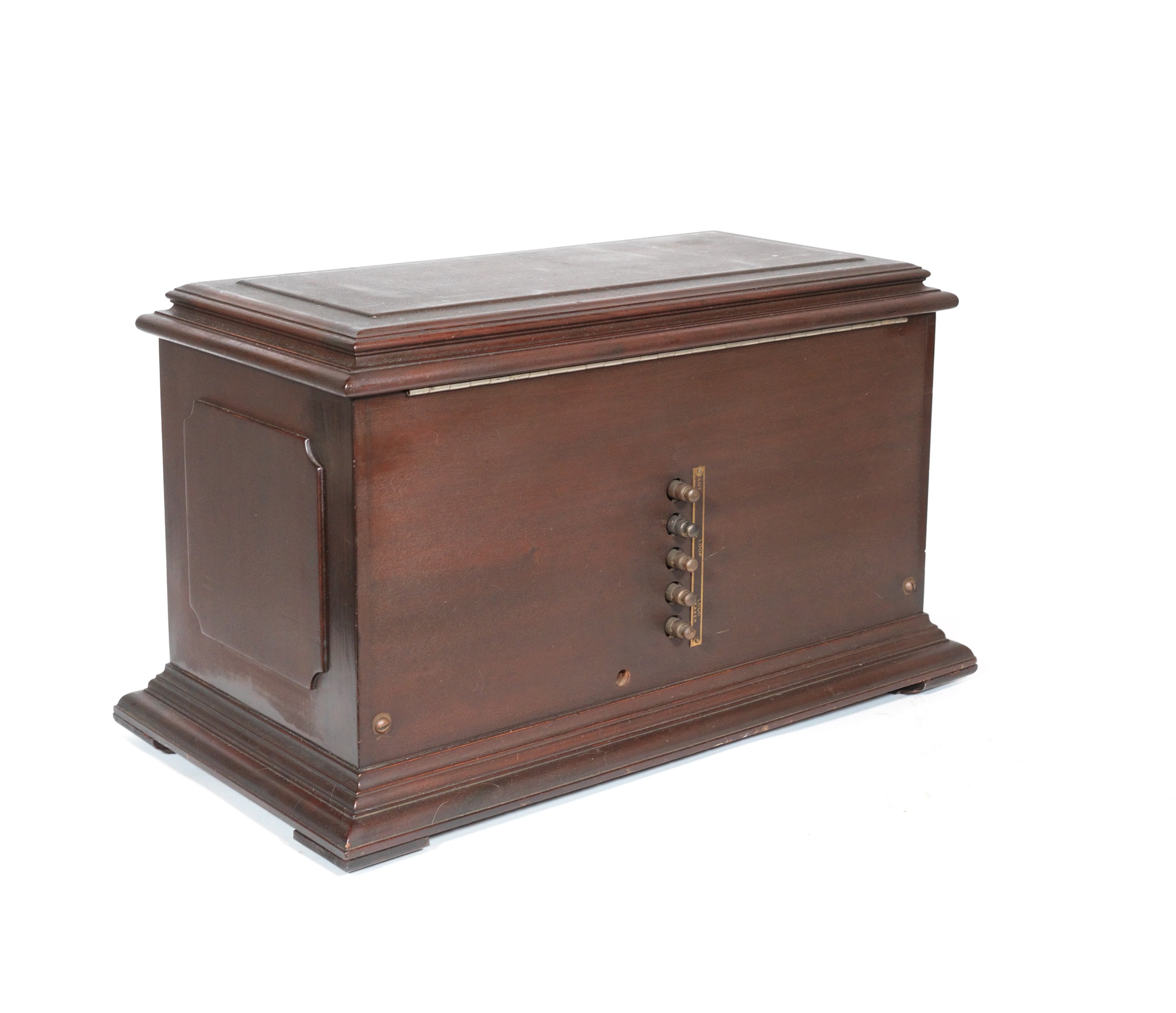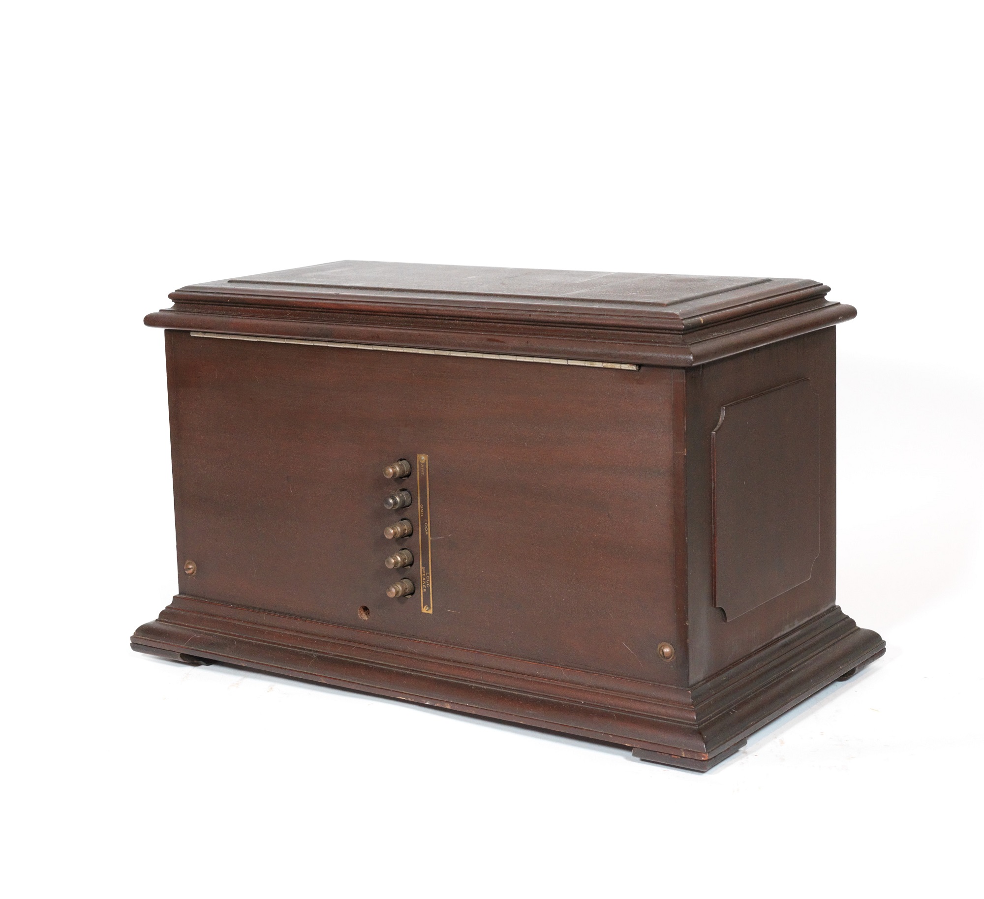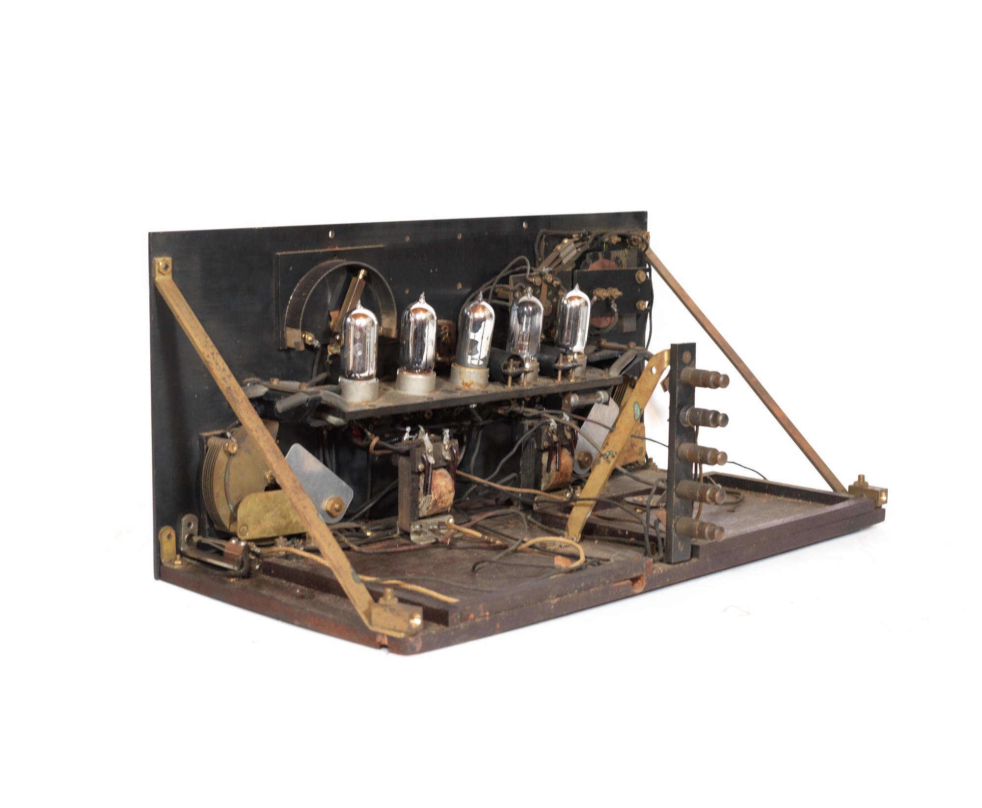 This example is in very good condition throughout, with a clean panel and a clean original cabinet finish that exhibits minor crazing consistent with its age. Chassis is straight, with nice original wiring and original battery wires (the Radiola VII’s dry cell batteries were stored in the cabinet). Push button filament switch is still operable, and all of the controls work as designed.